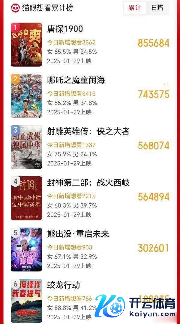 在猫眼平台上,收尾到1月16日,累计想看东谈主数最高的是《唐探1900》,迥殊85万,紧随自后的是《哪吒之魔童闹海》《射雕豪杰传:侠之大者》和《封神第二部:战火西岐》,分散为74万、57万和56万。