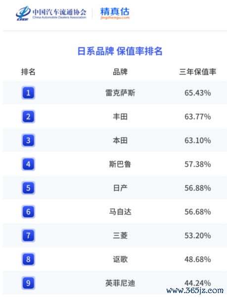 中国汽车流通协会发布的《2024年度上半年中国汽车保值率商量申报》线路,雷克萨斯以65.43%的收货取得日系品牌三年保值率排行第一。