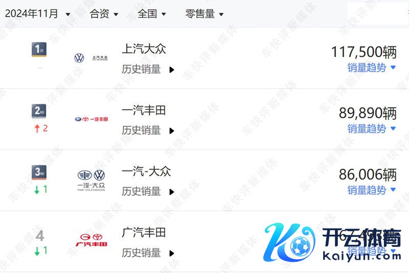 还所以11月销量为例,结伴车企中排名前三的按序为上汽公共、一汽丰田和一汽-公共。其中月销超10万辆的,唯有上汽公共,卖了11.8万辆车。一汽-公共销量唯有8.6万辆,比一汽丰田9万辆的销量收成还差了几千辆。