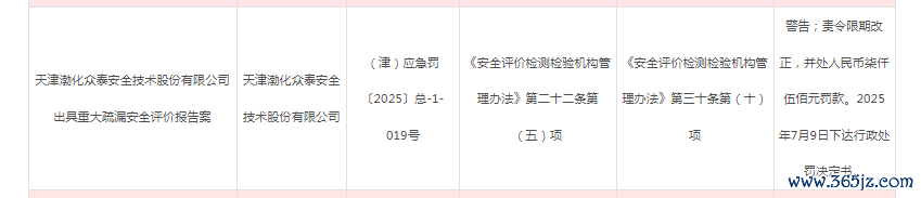 实质泄漏,渤化众泰公司案由为:安全评价检测检会机构安全出产检测检会敷陈存在端正圭臬援用无理、要害花样漏检、论断不解确等要紧疏漏,但尚未酿成要紧赔本。罚则条目为:安全评价检测检会机构管制目的(2019)第三十条第十一项。对此,天津市济急管制局对其作出劝诫;责令限期改正,并处东说念主民币柒仟伍佰元罚金的行政处罚。2025年7月9日下达行政处罚决定书。