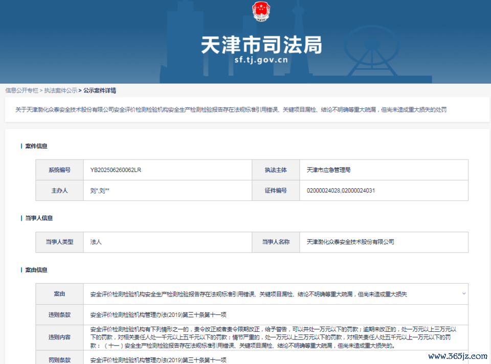 王人鲁晚报·王人鲁壹点记者于天津市司法局法则案件公示栏获悉,近日九游体育app(中国)官方网站,天津渤化众泰安全时刻股份有限公司(下称“渤化众泰公司”)收到行政处罚决定书,决定书文号(津)济急罚〔2025〕总-1-019号。据悉,此罚单在天津市济急管制局亦有通报。