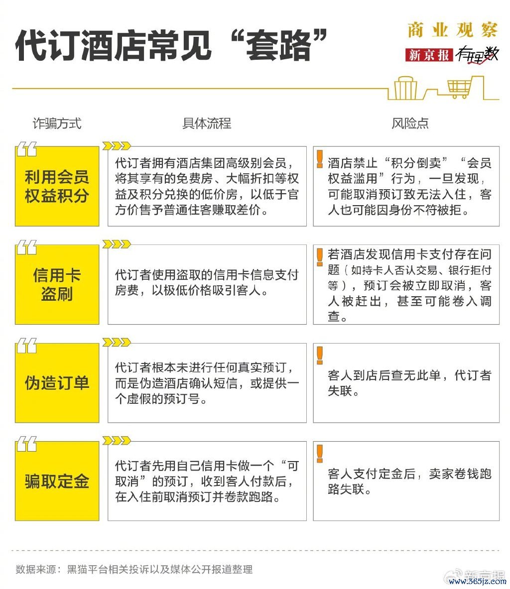 关于国外旅馆,骗子多通过信用卡盗刷、会员积分倒卖等形状敛财;而国内的本事则更为粗浅直白:商家或伪造阐述订单,或在入住前取消预订,以此来骗取耗费者定金,最终酿成耗费者的吃亏。