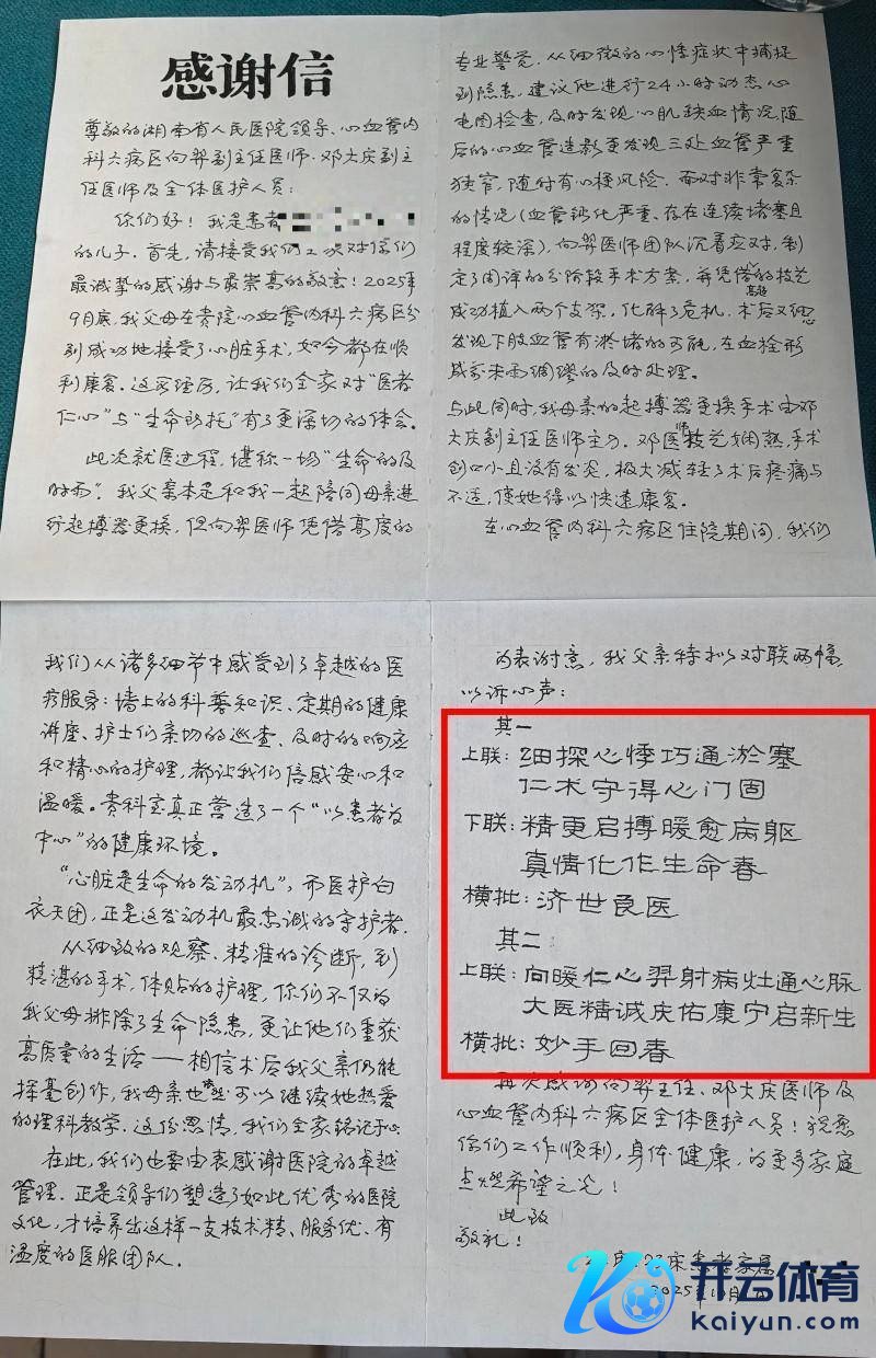 长沙晚报掌上长沙10月15日讯(全媒体记者 杨云龙 通信员 梁辉 瞿佳妮)“向暖仁心,羿射病灶通心脉;大医精诚,庆佑康宁启更生。”“心术相应,羿鸣惊东说念主;爱暖病患,庆佑祯祥。”本日,记者在湖南省东说念主民病院心血管内科六病区看到一封八旬患者手写的千字感谢信。终点的是开云体育,这封感谢信里有两副包含两位大夫名字的藏字联,以此抒发对医护东说念主员的感谢。这一举动,也深深感染了医护东说念主员……
