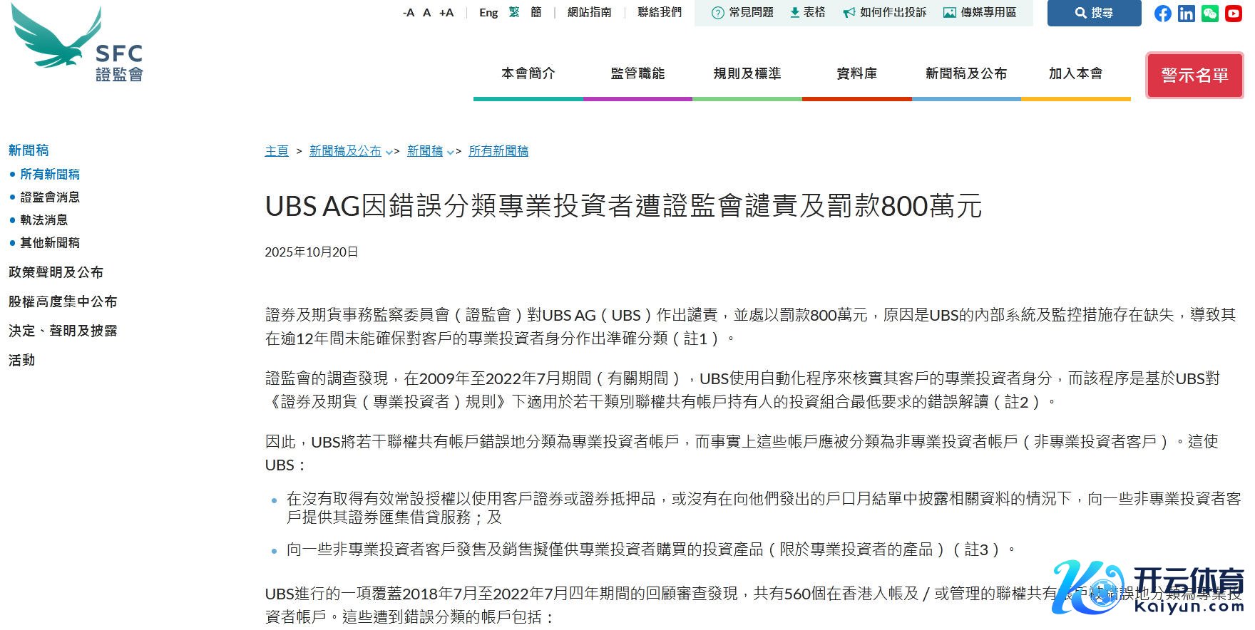 中新经纬10月20日电 香港证监会网站20日败露开yun体育网,UBS AG因失实分类专科投资者被罚金800万元。